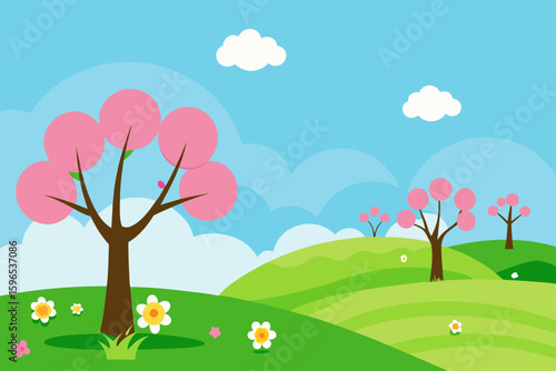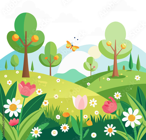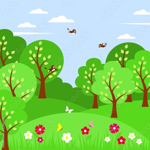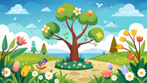 Весенний лес с деревом и цветами в цвету векторная иллюстрация. Лесной массив, вырезанный из натуральной бумаги в стиле оригами. Идиллический пейзаж, панорамный сельский пейзаж с концепцией полей полевых цветов