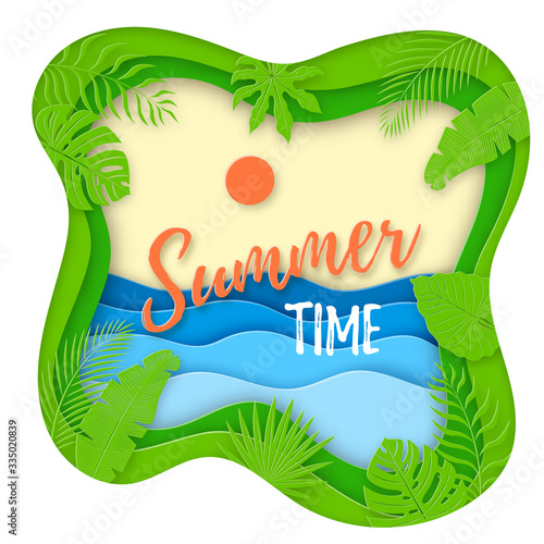 Векторная иллюстрация в стиле весеннего многослойного бумажного искусства. Красивая сезонная композиция с вырезанной из бумаги зеленой травой, желтыми тюльпанами, белыми птицами, сидящими на ветке. Весенняя креативная типография с надписями от руки.