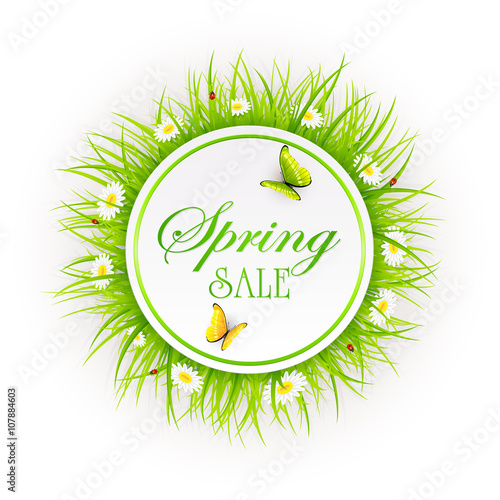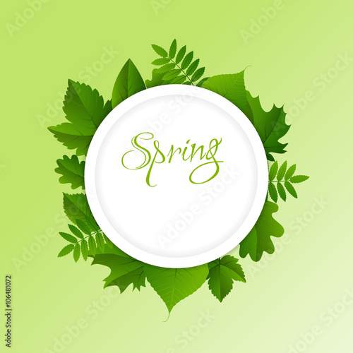 Декоративная рамка с зеленой листвой Весенняя распродажа креативная типография с надписями от руки, векторная иллюстрация в стиле бумажного искусства. Рекламный баннер сезонной весенней распродажи, шаблон плаката.