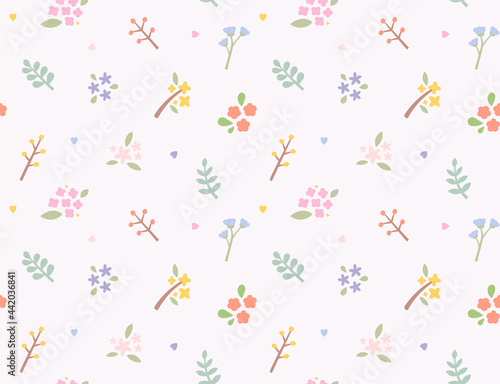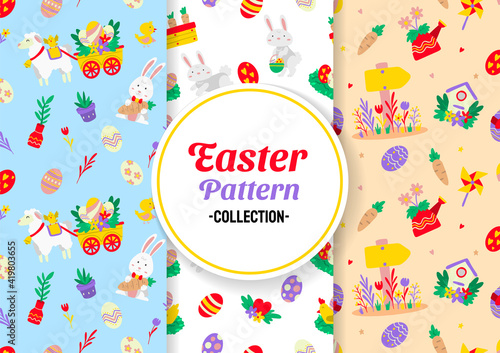 Набор бесшовных узоров весенних животных, векторная иллюстрация. Весенний детский фон, обои с милыми кошками и лесными животными, цветами, птицами.