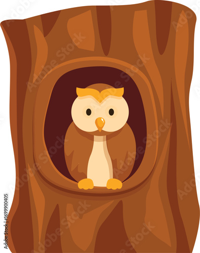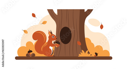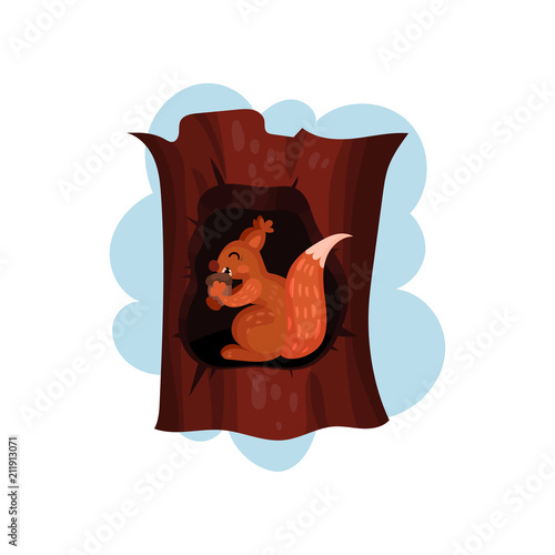 Мультяшная белка с желудем в векторе дупла ствола дерева. Персонаж животного - пушистый грызун из лесных дубрав, изолированный на белом фоне