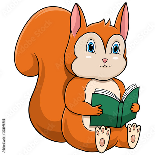 Белка с книжным вектором. Значок читающего животного. Симпатичный умный лесной персонаж, читающий иллюстрацию. Счастливый любитель мультяшной литературы о грызунах, изолированный на белом фоне