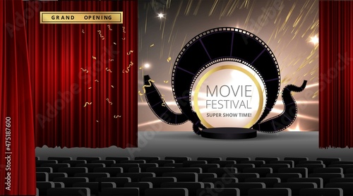 Шаблон баннера для стендап-плаката онлайн. Векторная иллюстрация красной театральной сцены и мобильного телефона с вывеской комедийного шоу на экране.