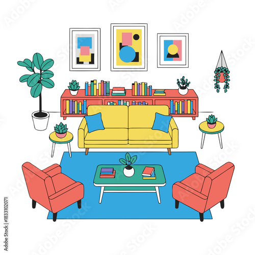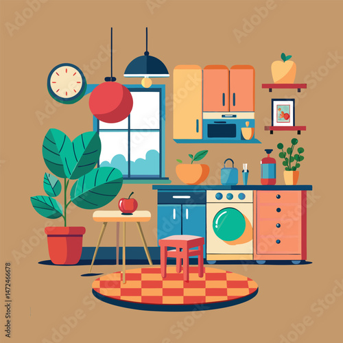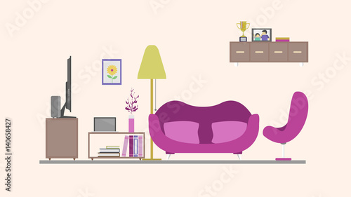 Домашний интерьер для отдыха дома и занятий йогой тематический плакат, флаер, баннер, векторная иллюстрация дизайна в плоском стиле. Онлайн-йога, оставайтесь дома на карантине. Профилактика распространения коронавируса COVID-19.