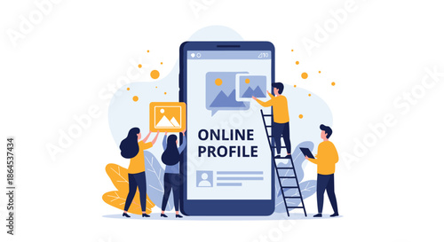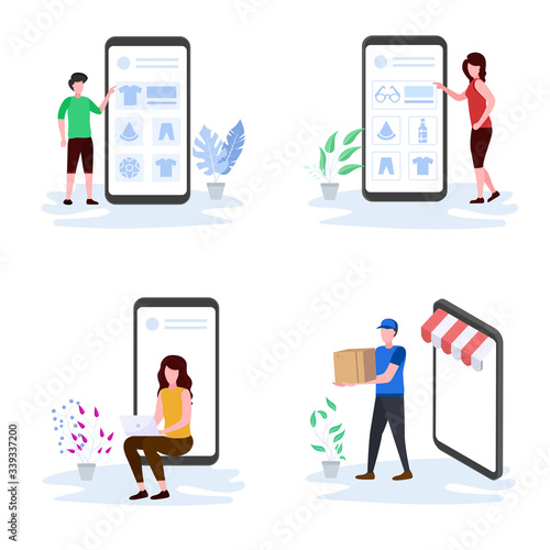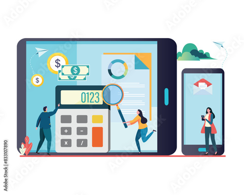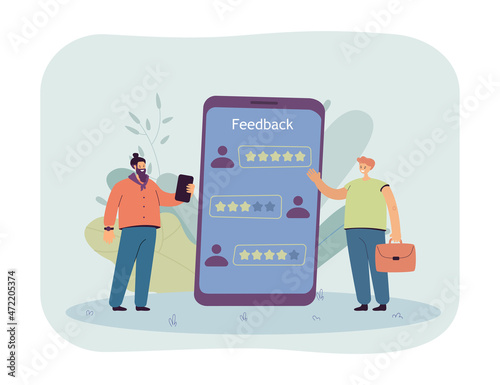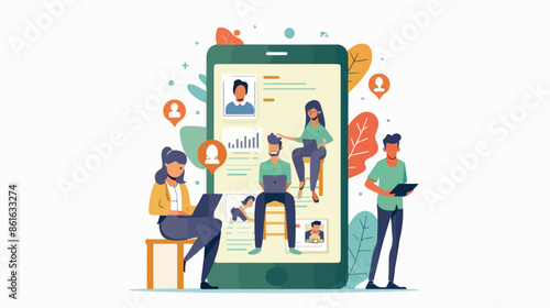 Векторная иллюстрация дизайна в плоском стиле большого смартфона, монитора компьютера, крошечных людей, отправляющих и получающих сообщения. Оставайтесь на связи с помощью мобильного телефона, планшета, оставайтесь на связи, приложения для обмена сообщениями