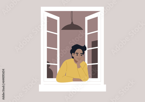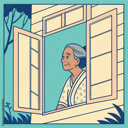 Пожилая пара, стоящая у окна, векторная плоская иллюстрация. Оставайтесь дома, проводите карантинные профилактические меры, чтобы оставаться здоровыми во время пандемии коронавируса. Профилактика распространения нового вируса COVID-19.