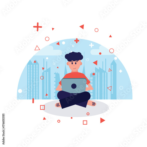 Шаблон векторного плаката "Оставайся дома". Молодая девушка расслабляется, медитируя, сидя в позе йоги. Мобильный телефон, ноутбук, наушники, книга, гантели, выпускная шляпа вокруг нее. Домашний карантин, самоизоляция