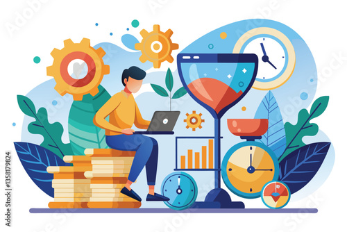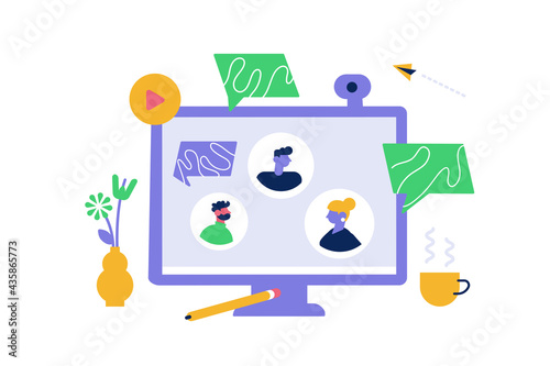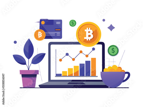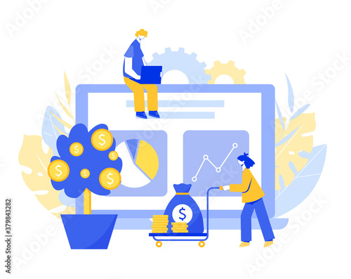 Фондовый рынок и концепция торговли плоская векторная иллюстрация. Экран компьютера, доска с данными фондового рынка и успешными деловыми людьми, счастливыми трейдерами, золотыми монетами.