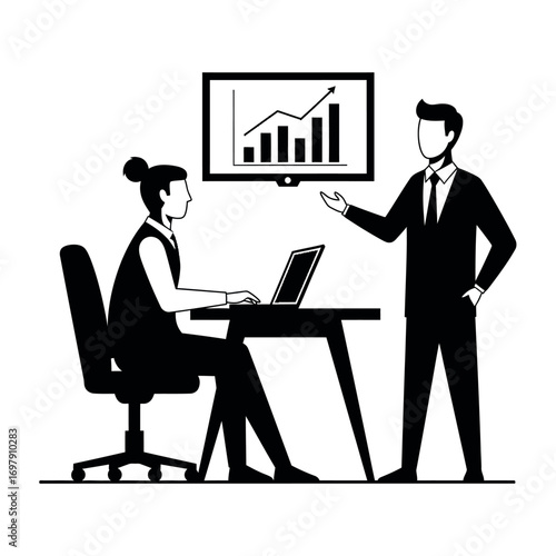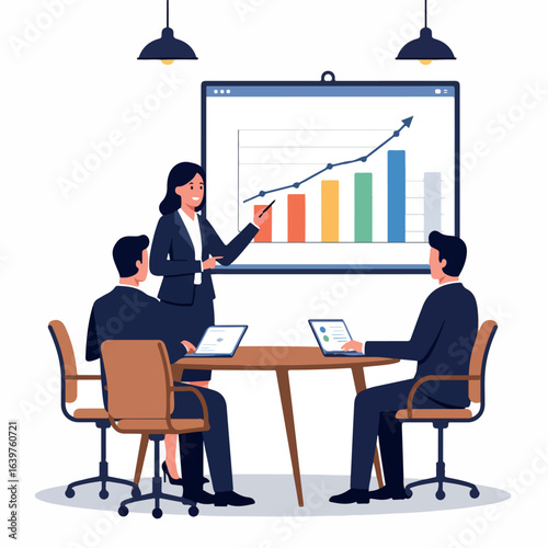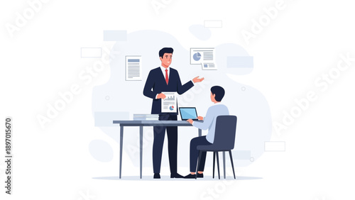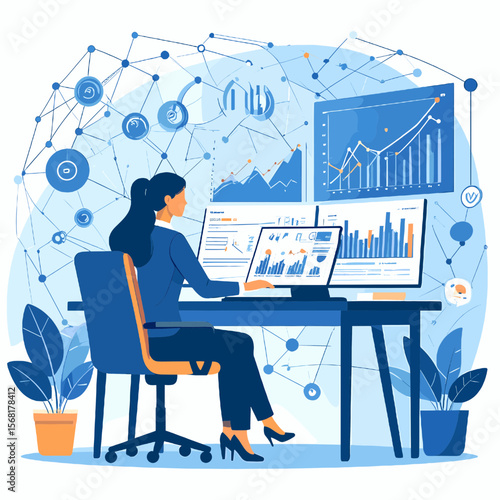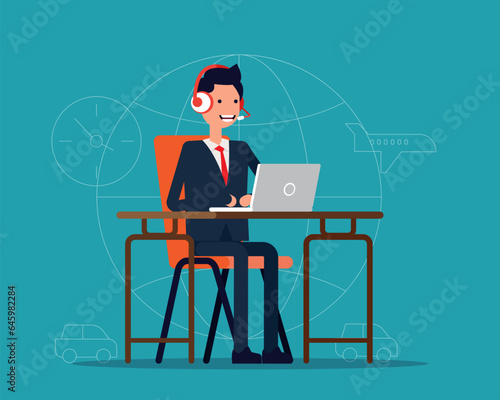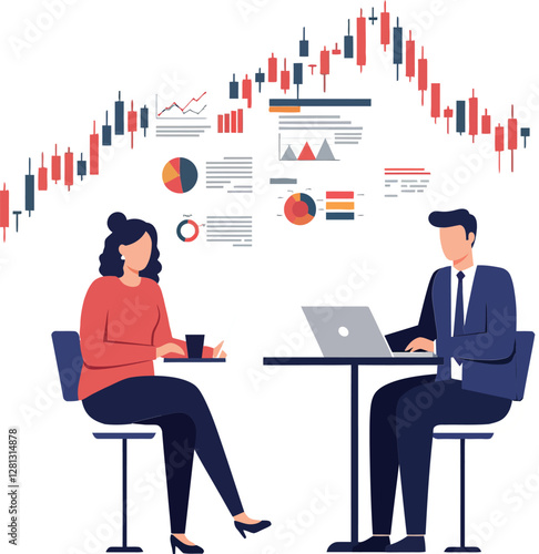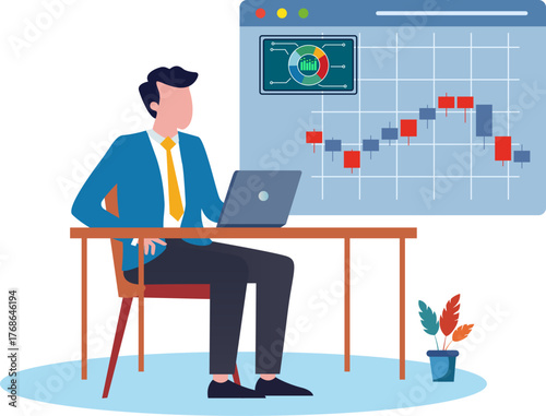 Векторная иллюстрация концепции фондового рынка, инвестиций и торговли. График свечей и грустный бизнесмен, несчастный трейдер, смотрящий на монитор компьютера, сидя за столом трейдера.