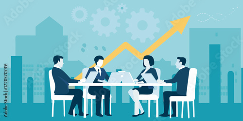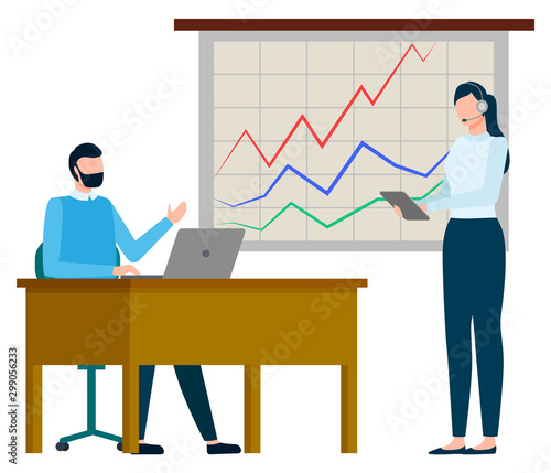 Векторная иллюстрация концепции фондового рынка, инвестиций и торговли. График свечей и успешный бизнесмен, счастливый трейдер, смотрящий на монитор компьютера, сидя за столом трейдера с поднятыми руками.