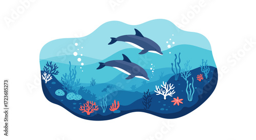 Остановить загрязнение океана пластиком, векторная иллюстрация в стиле бумажного искусства. Подводное море с пластиковым мусором в форме дельфина, морских животных, коралловых рифов. Концепция экологической проблемы океана.