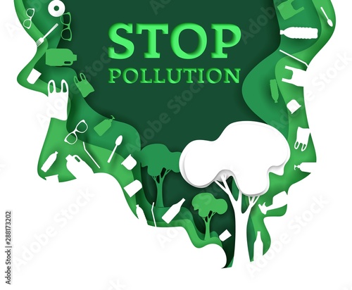 Остановить загрязнение окружающей среды, векторная иллюстрация в современном стиле бумажного искусства. Спасите зеленый лес от пластикового мусора, концепция сохранения природы и окружающей среды для плаката, баннера, страницы веб-сайта и т.д.