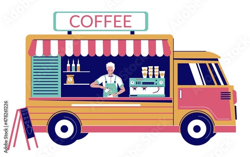 Кофейный грузовик, кофейня и уличное кафе с персонажами мужского пола-бариста, готовящими горячие энергетические напитки для посетителей, векторная плоская иллюстрация. Автобус с уличной едой, уличное кафе, терраса, концепция кофейни.
