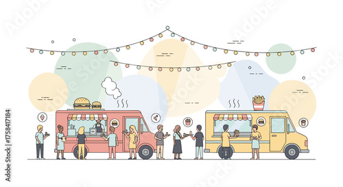 Векторный баннер концепции фестиваля уличной еды. Люди продают еду из киосков в парке. Тележка с хот-догами.