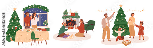 Сцена фестиваля уличной еды с персонажами "счастливых людей". Приготовление и продажа праздничных блюд, праздничный ужин, обслуживание грузовиков с векторной иллюстрацией