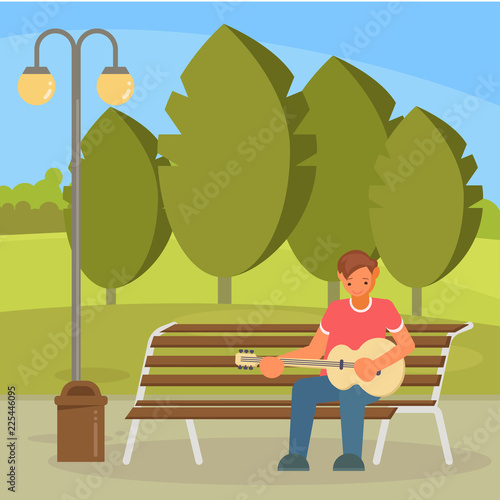 Уличный музыкант играет на гитаре, сидя на скамейке в городском парке. Векторная иллюстрация в плоском стиле. Элемент дизайна концепции музыкального хобби.