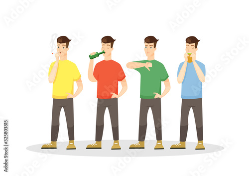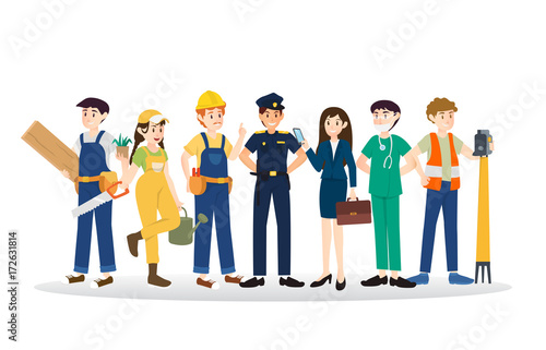Набор векторных значков уличных людей. Дворник или дворник, продавец мороженого, скейтбордист, водитель такси и молодой человек в наушниках, слушающий музыку, элементы дизайна в плоском стиле.