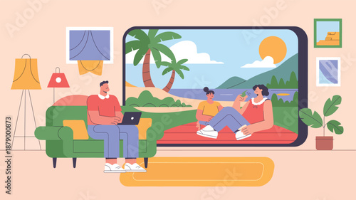 Усталый напряженный папа работает на компьютере, в то время как непослушный ребенок мешает ему выполнять свою работу, плоская векторная иллюстрация. Удаленная работа, фриланс. Родительский стресс, родительские проблемы при воспитании детей.