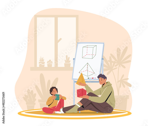 Усталый напряженный папа работает за компьютером, в то время как непослушный ребенок мешает ему выполнять свою работу, плоская векторная иллюстрация. Удаленная работа, фриланс. Родительский стресс, родительские проблемы при воспитании детей.