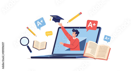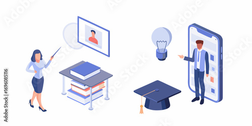 Векторная изометрическая иллюстрация концепции студенческого кредита. Соглашение о студенческом кредите с книгами, выпускной шляпой и студенческим займом денег для оплаты обучения.