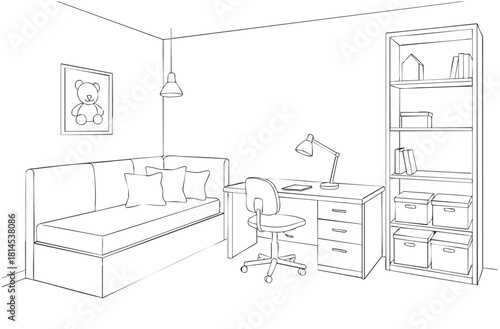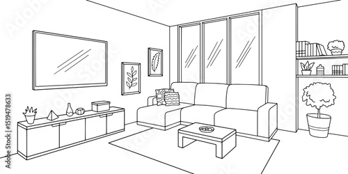 Векторная иллюстрация интерьера квартиры-студии в стиле line art. Диван, журнальный столик, кухонная мебель, книги и комнатные растения на полках, картина на стене. Дизайн интерьера уютного дома.