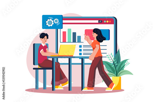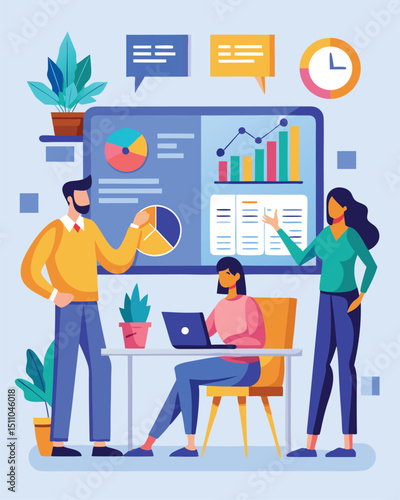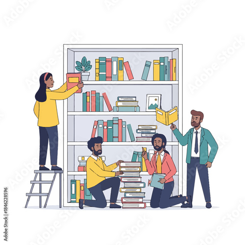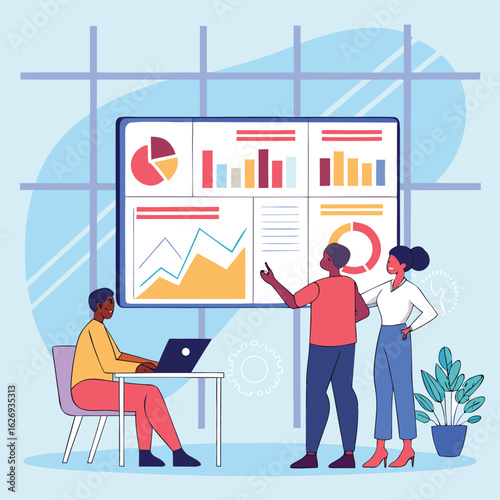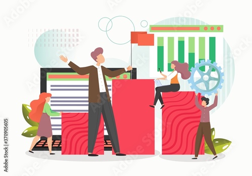 Успешный бизнесмен-лидер с красным флагом, ведущий свою команду к успеху, векторная плоская иллюстрация. Мужские и женские персонажи-коллеги строят гистограмму, держа в руках снаряжение. Концепция лидерства в бизнесе.