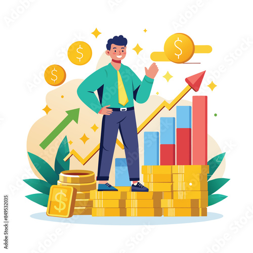 Успешный бизнесмен, стоящий на золотом слитке с кубком трофея в поднятых руках, плоская векторная изометрическая иллюстрация. Успех в бизнесе, концепция финансового роста.