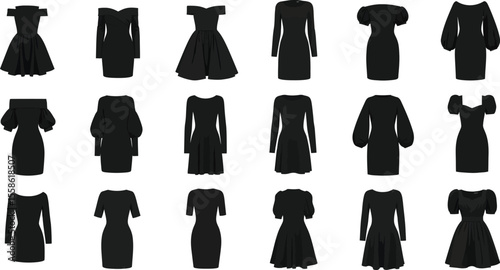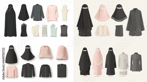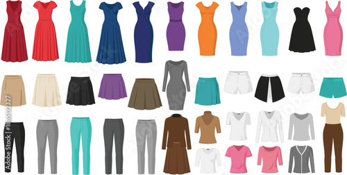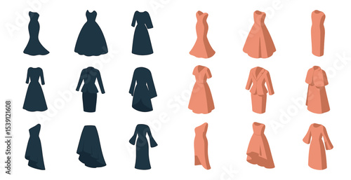 Костюмы и платья на манекене в векторном наборе строк. Элегантная женская и мужская одежда. Выставка модной одежды и аксессуаров. Иллюстрация магазина, бутика одежды