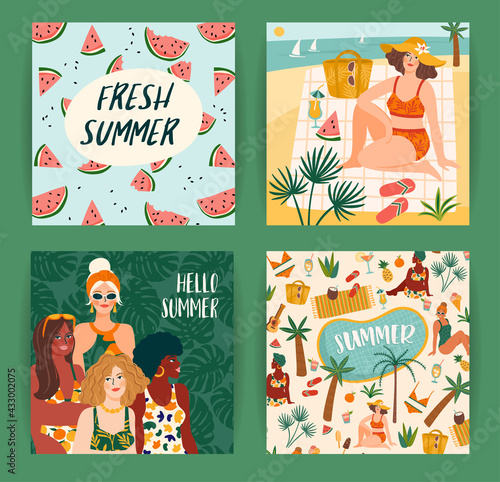 Набор летних открыток, векторная рисованная иллюстрация. Привет, лето, алоха, я люблю лето, надписи на летних каникулах и милых животных белку, ежика, лису с ананасами и ломтиками арбуза.