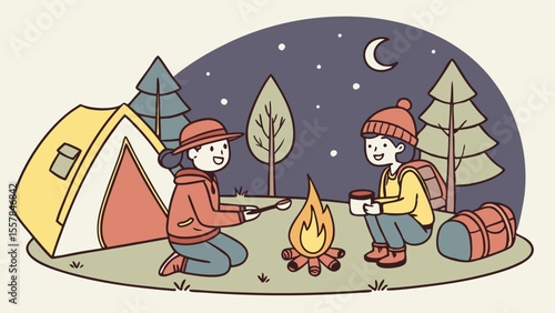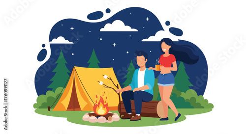Летняя сцена барбекю. Женщина, играющая на гитаре, сидя у костра, плоская векторная иллюстрация. Корзина для пикника. Приготовление пищи на огне, пикник на открытом воздухе, пикник, вечеринка с барбекю.
