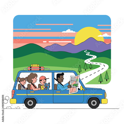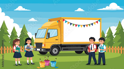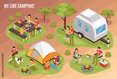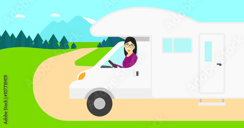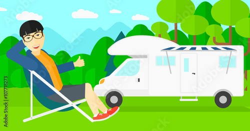 Летняя сцена барбекю. Молодая женщина читает журнал, лежа на одеяле рядом с автофургоном, плоская векторная иллюстрация. Девушка, путешествующая в доме на колесах. Летний лагерь отдыха, вечеринка с барбекю.