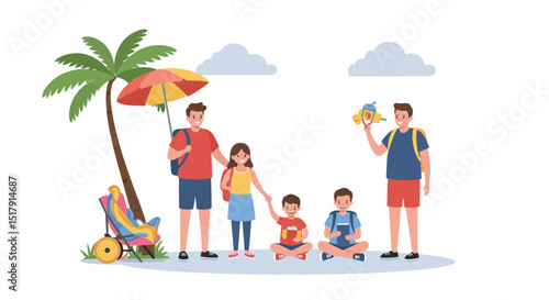 Набор летних пляжных развлечений, плоская векторная изолированная иллюстрация. Люди читают, загорают под зонтиком, занимаются серфингом, встают на весла, отдыхают с палаткой, играют в мяч. Летние каникулы.