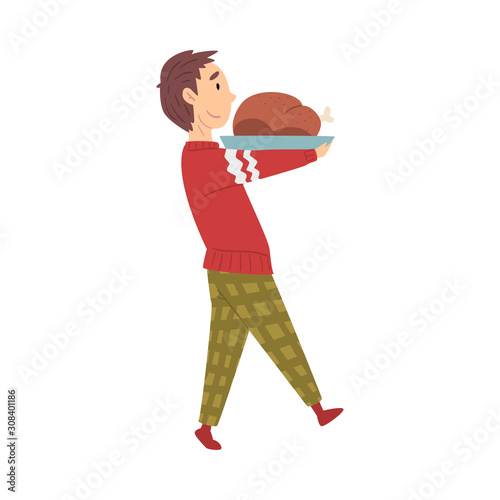 Человек, несущий летние свежие фрукты и кукурузу, векторная плоская иллюстрация, изолированная на белом фоне. Летние каникулы, лето, путешествия.