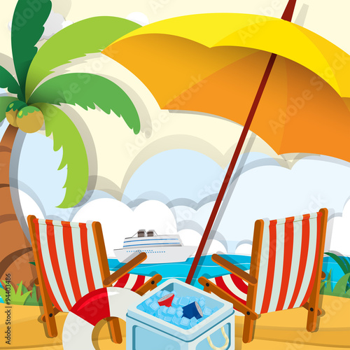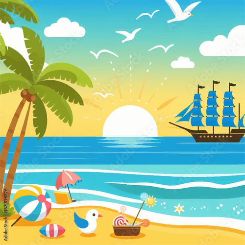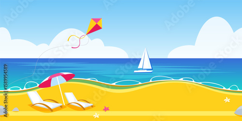 Иллюстрация векторной вырезки из бумаги летнего пляжа. Океанский пляж с шезлонгом, шлепанцами, солнцезащитными очками, пальмовыми листьями, морскими звездами, лодкой, плывущей по воде. Концепция летних каникул для плаката, баннера, открытки.