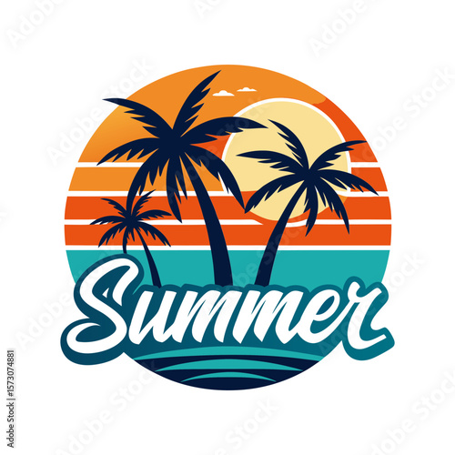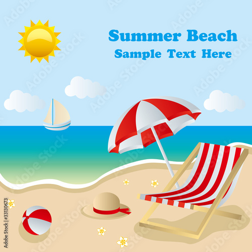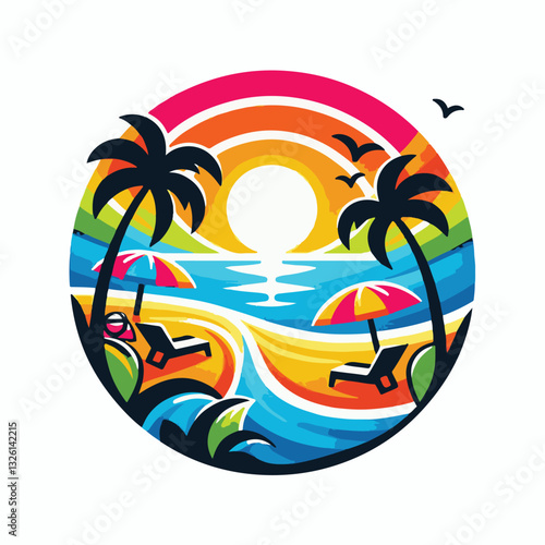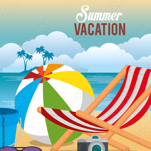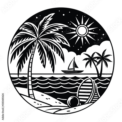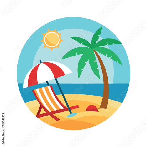 Иллюстрация векторной вырезки из бумаги летнего пляжа. Океанский пляж с шезлонгами, тропическими пальмовыми листьями и морскими звездами по кругу. Концепция пляжного отдыха для плаката, баннера, летней открытки.