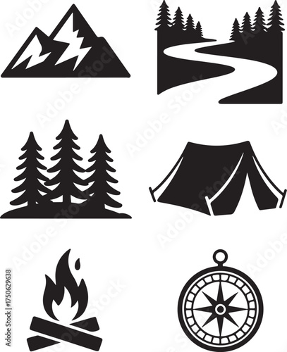 Летний лагерь в лесу, векторная винтажная этикетка. Значок с изображением туристической палатки, костра на открытом воздухе и скрещенного топора на белом фоне