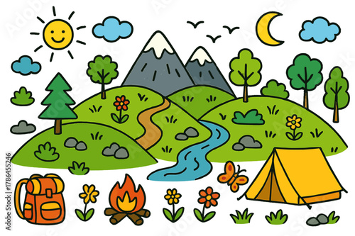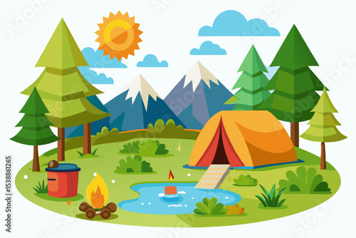 Летний кемпинг в лесу, векторная иллюстрация в стиле бумажного искусства. Туристическая палатка и костер на лесной поляне. Пеший туризм, треккинг, плакат о летних каникулах, шаблон баннера.
