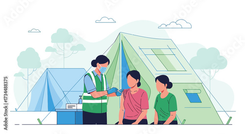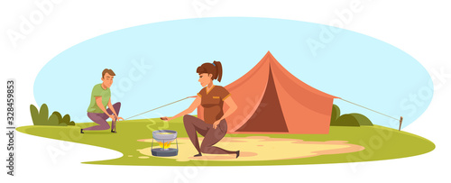 Шаблон веб-сайта целевой страницы кемпинга. Векторная иллюстрация людей, стоящих рядом с костром и палаткой в лесу. Концепция летнего кемпинга, пешего туризма, треккинга.