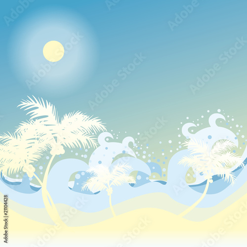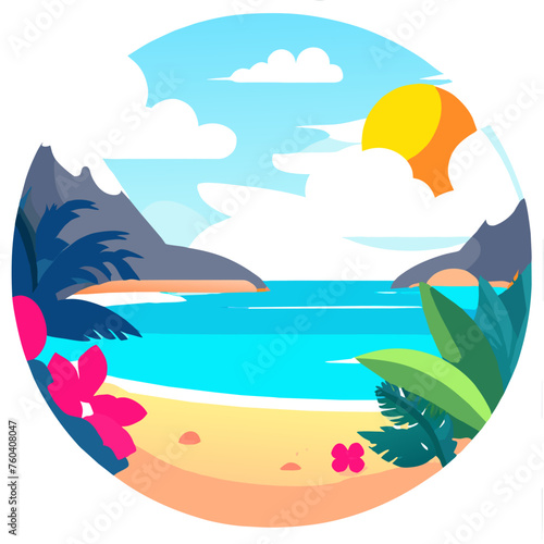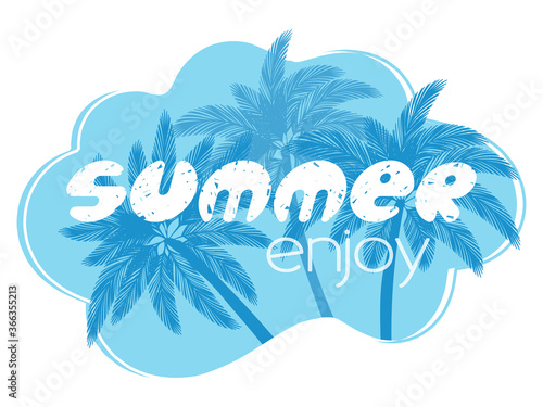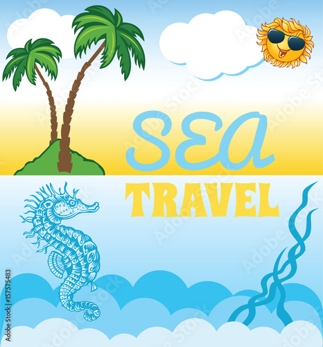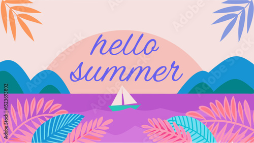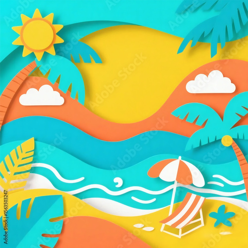 Векторная иллюстрация в стиле летнего многослойного бумажного искусства. Красивая тропическая композиция с вырезанными из бумаги океанскими волнами, лодкой, пальмой, цветами, солнечными облаками, чайками. Летняя креативная типография с надписями от руки