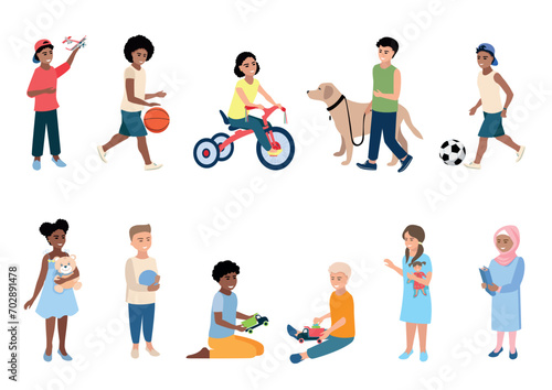 Набор векторных значков летних людей. Группа людей путешествует, загорает, катается на водных лыжах, играет во фрисби, занимается серфингом, ест мороженое. Элементы дизайна в плоском стиле, выделенные на белом фоне.