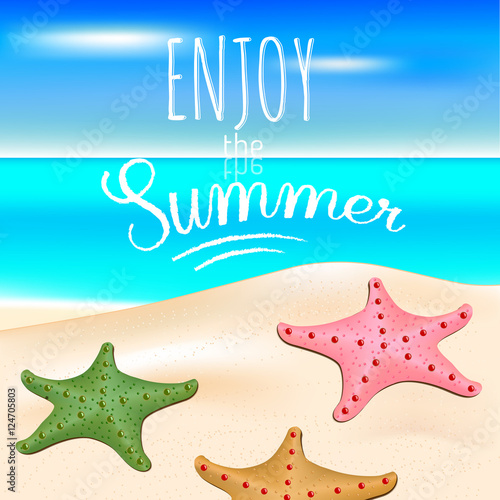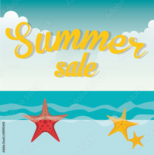 Плакат летней распродажи, шаблон баннера. Вырезанные из векторной бумаги океанские волны, песок, шлепанцы и морские звезды.