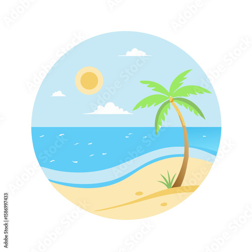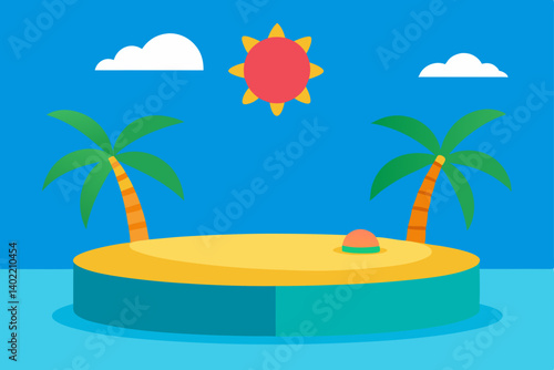 Вектор летнего морского пляжа. Художественный плакат, вырезанный из дорожной бумаги. Фон для тропического отдыха. Остров оригами с пальмой, океанской волной и небом. Приключения и туризм