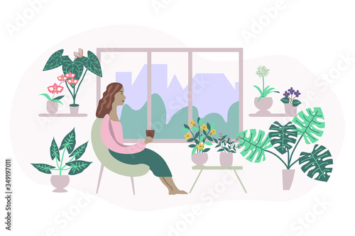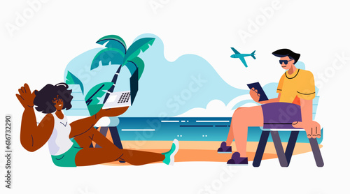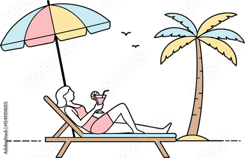 Девушки загорают на шезлонге, пьют коктейль, мужчина бегает с доской для серфинга, векторная иллюстрация дизайна в плоском стиле. Летний пляжный отдых, путешествия, серфинг, концепция водных пляжных развлечений.