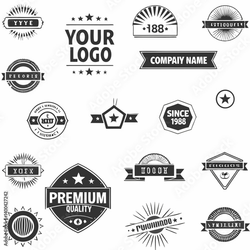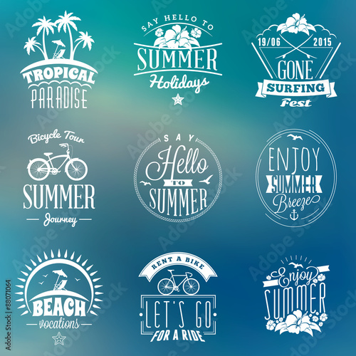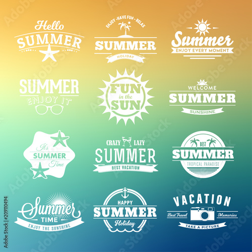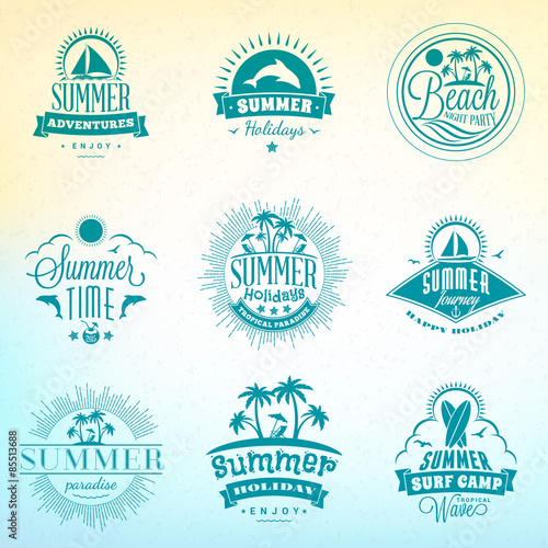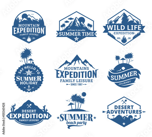 Винтажный логотип летнего путешествия во времени, этикетка, набор значков, векторная иллюстрация. Летние каникулы, круизные каникулы, пляжная вечеринка, дорожная поездка белые эмблемы на синем фоне.