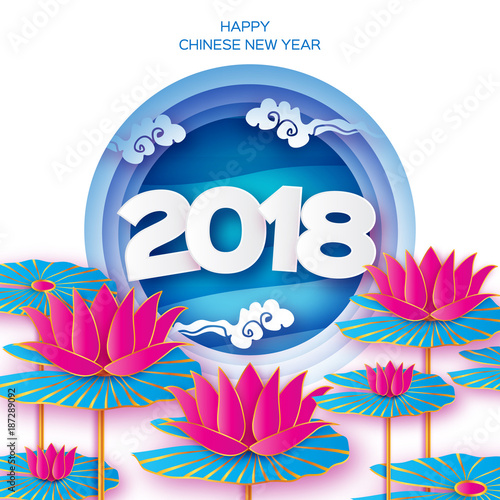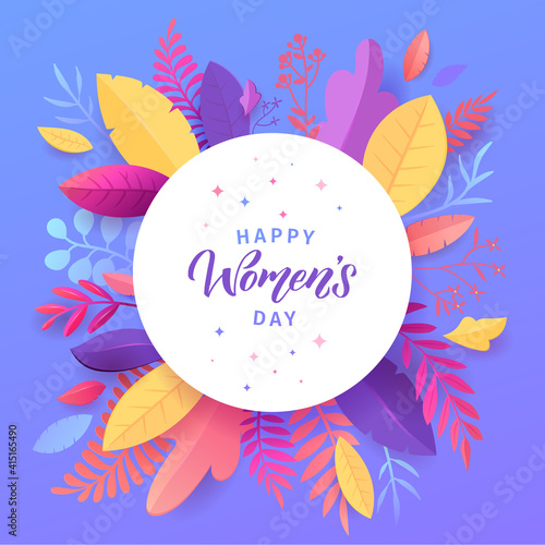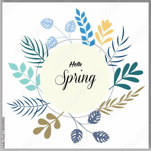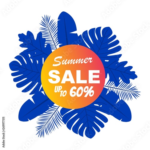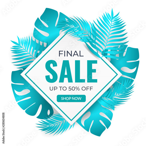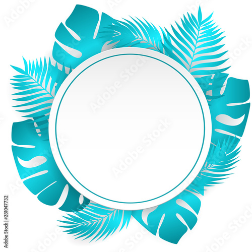 Летняя тропическая зелень в круглой рамке, векторная иллюстрация в стиле бумажного искусства. Красивая сезонная композиция с тропической пальмой и листьями монстеры в сине-белых тонах для открытки, баннера и т.д.