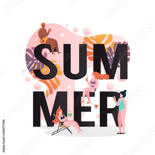 Летнее слово заглавными буквами со счастливыми людьми, загорающими, едящими мороженое, пьющими коктейль, векторная плоская иллюстрация. Пляжный отдых, лето, композиция для путешествий для веб-баннера, страницы веб-сайта.