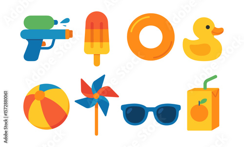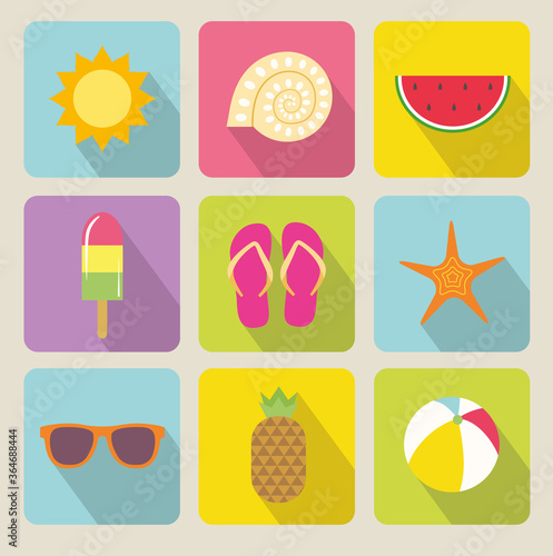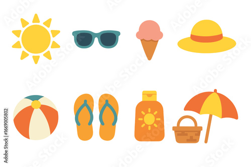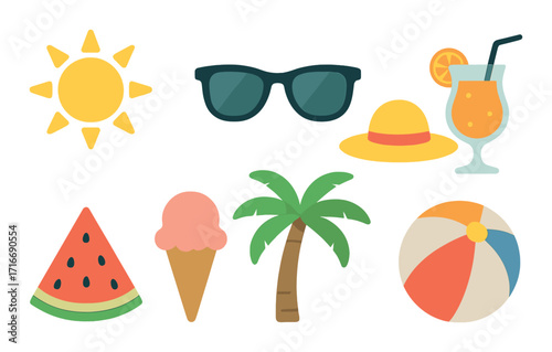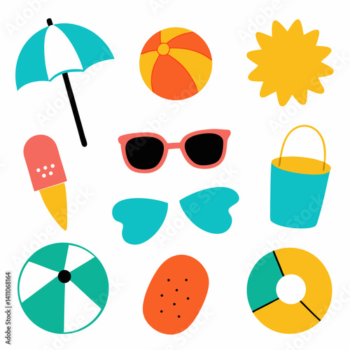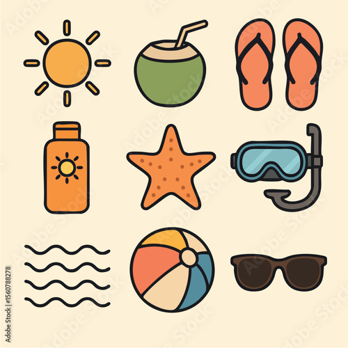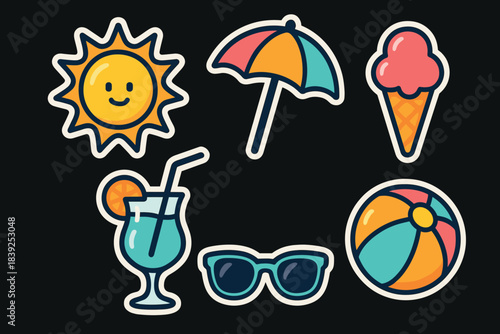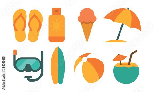Летний значок, изолированный векторный набор. Солнцезащитный крем, солнцезащитные очки, надувной мяч, мороженое, тапочки, солнце, сумка для багажа, ломтик арбуза, маска для подводного плавания с маской для дайвинга иллюстрация предмета для отдыха