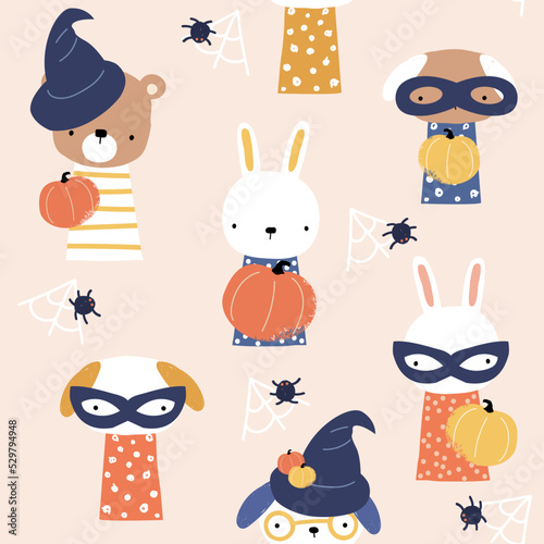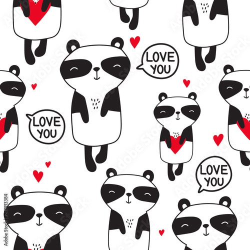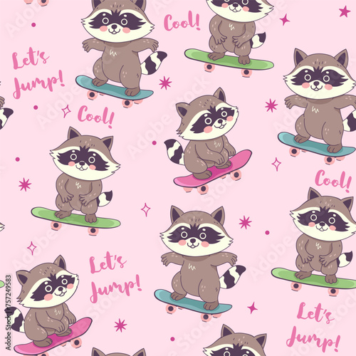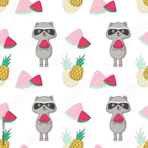 Летний бесшовный узор. Векторные нарисованные от руки еноты, ананасы и ломтики арбуза.
