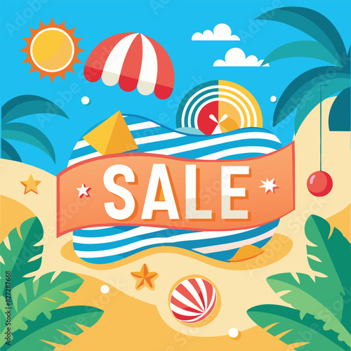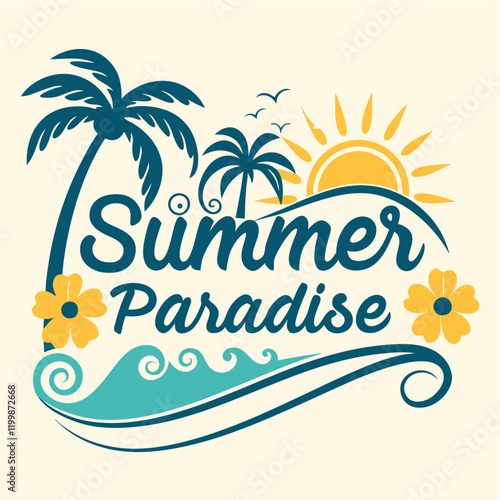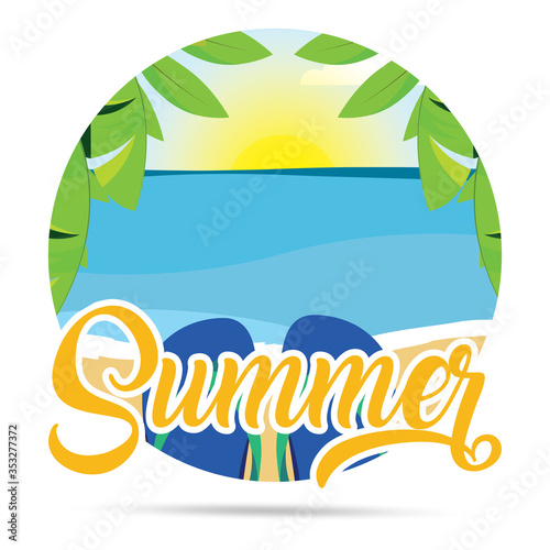 Летняя векторная иллюстрация, вырезанная из бумаги. Тропический пейзаж с океанскими волнами, песком, пальмовыми листьями, пляжным зонтиком, шлепанцами, солнцезащитными очками, морскими звездами. Плакат о пляжном отдыхе, шаблон летней открытки-баннера.