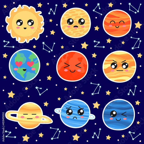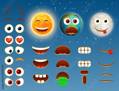 Создатель эмодзи Солнца, планеты Земля и Луны, создатель смайликов. Векторный набор частей тела смайликов для вашего собственного создания крутых смайликов.
